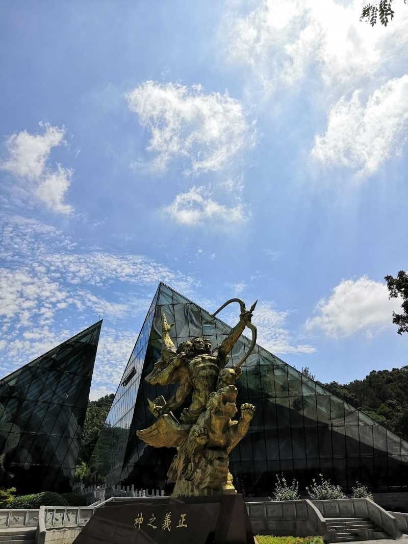 進(jìn)入紀(jì)念館大門,青銅雕塑“正義之神”映入我們眼簾,三頭六臂的正義之神跨坐在飛天虎上,手中的利箭直指長(zhǎng)空。象征著中、蘇、美三國(guó)團(tuán)結(jié)一心聯(lián)合抗戰(zhàn)的決心和氣勢(shì),象征著國(guó)際統(tǒng)一戰(zhàn)線的戰(zhàn)無(wú)不勝的力量。一旁的紀(jì)念碑上鐫刻著兩列墓志銘:悍國(guó)騁長(zhǎng)空,偉績(jī)光照青史冊(cè);凱旋埋烈骨,豐碑美媲黃花崗。
