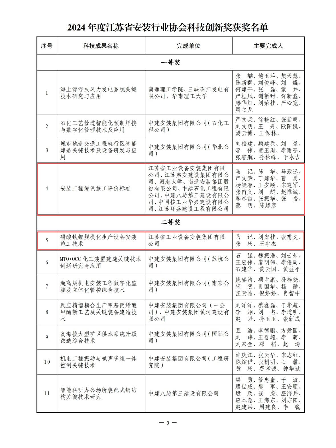 近日,江蘇省安裝行業(yè)協(xié)會《關(guān)于公布2024年度江蘇省安裝行業(yè)協(xié)會科技創(chuàng)新獎獲獎名單的決定》文件公布。經(jīng)企業(yè)申報、協(xié)會初審、專家專業(yè)審查、評審會審定、協(xié)會網(wǎng)站公示,共計(jì)20項(xiàng)成果獲評,其中我司參與成果“安裝工程綠色施工評價標(biāo)準(zhǔn)”獲評一等獎,我司獨(dú)立申報成果“磷酸鐵鋰規(guī)?;a(chǎn)設(shè)備安裝施工技術(shù)”獲評二等獎。