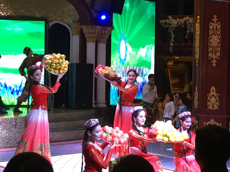 酒店的餐廳和飲食頗有特色,每天吸引了眾多食客來此用餐。給我印象深刻的是,在這里入住,不僅可以品嘗正宗的新疆美食,還能免費(fèi)欣賞到充滿民族風(fēng)情的歌舞表演。維吾爾族能歌善舞,維族美女婀娜多姿,的確名不虛傳。頭戴小花帽的男主持人語言幽默,擅長與客人互動,在感染力極強(qiáng)的維族音樂聲中,常能激發(fā)客人的跳舞欲望,再與維族演員手拉手共舞,現(xiàn)場氣氛掀起陣陣高潮。